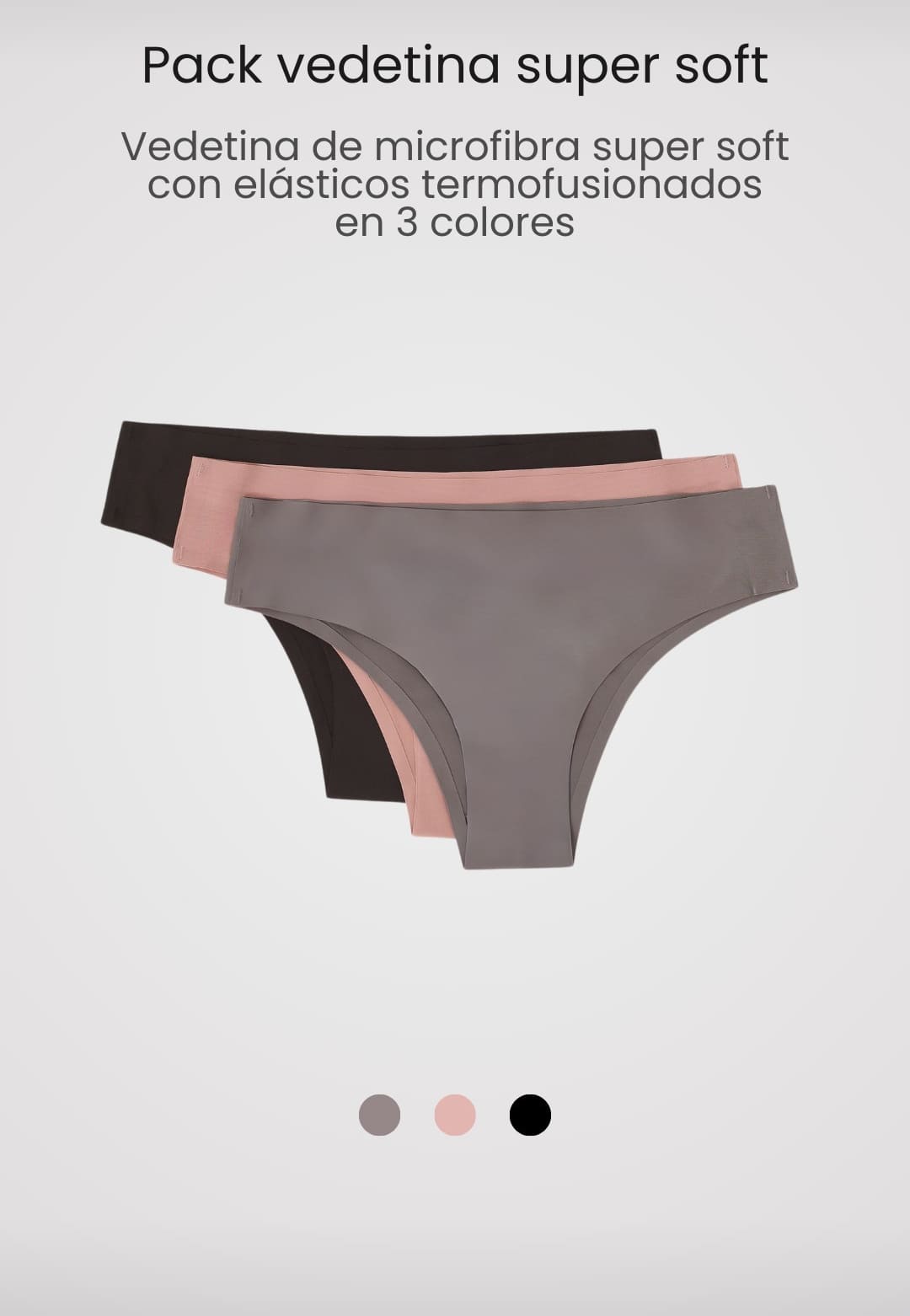 DESCRIPCIÓN: PACK x 3 Vedetina de microfibra supersoft con elásticos termofusionados. Brinda un calce perfecto y efecto segunda piel. Combínalo con el corpiño o top super soft